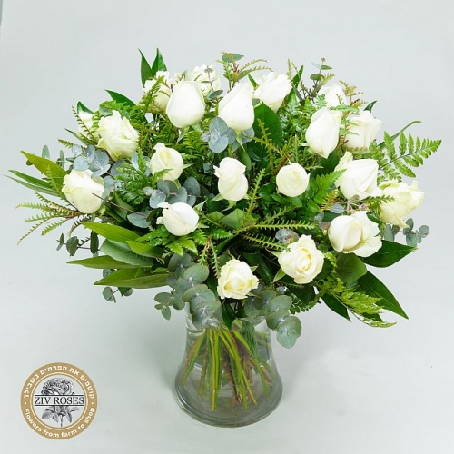 זר המשלב ורדים לבנים, ענפי ירק וענפי קישוט. במידה ואחד מהפרחים חסר, נבחר את המתאים ביותר. המחיר אינו כולל ואזה.
